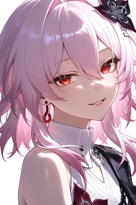분홍색 머리카락, 장갑, 긴 머리카락, 빨간 눈, 드레스, 머리 장식, 귀걸이, 검은 드레스, 검은 장갑, 눈 사이의 머리카락, 긴 소매, 매우 긴 머리카락