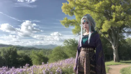 자리 전체에 꽃과 나무가 넓게 퍼진 들판에 보라색 드레스를 입고 선녀처럼 서 있는 여성. 1girl, 파란 하늘, 흐릿함, 군데군데 쌓인 덤불, 중국 옷, 구름, 흐린 하늘, 낮, 들판, 꽃, 꽃밭, 머리 장식, 아카시아, 보석, 긴 소매, 메이크업, 산, 자연, 야외, 보라색 꽃, 풍경, 하늘, 솔로, 나무, 흰 머리카락