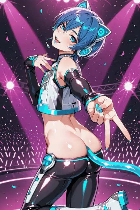 옷 프롬프트: 헤드폰, 이어폰, 크롭탑, 다채로운 상의, 흰색 상의, 파란 테두리, 회색 테두리, 소매 없는 조끼, 분리된 소매, 소매가 손목을 넘음, 사이안 테두리, 손가락이 없는 장갑, 꼭 맞는 바지, 검은 바지, (lowleg pants, :1.2)