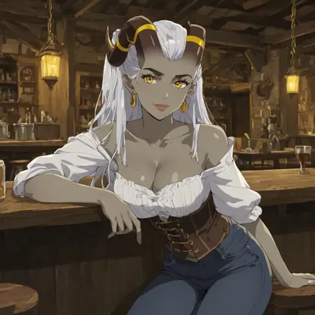 qwydion, earrings, yellow eyes, horns, white hair, grey skin,