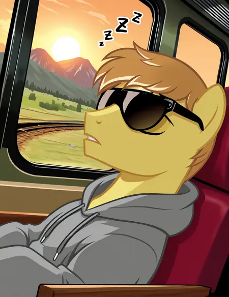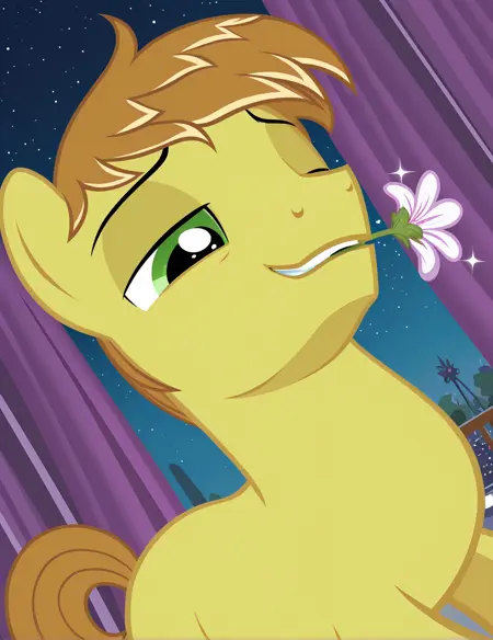 male, yellow skin, light brown hair with light yellow tips, short trimmed curved tail, green eyes, cutie mark featuring a pink feather and a small heart is visible on its flank.