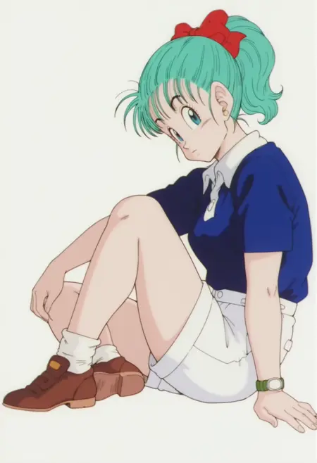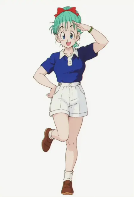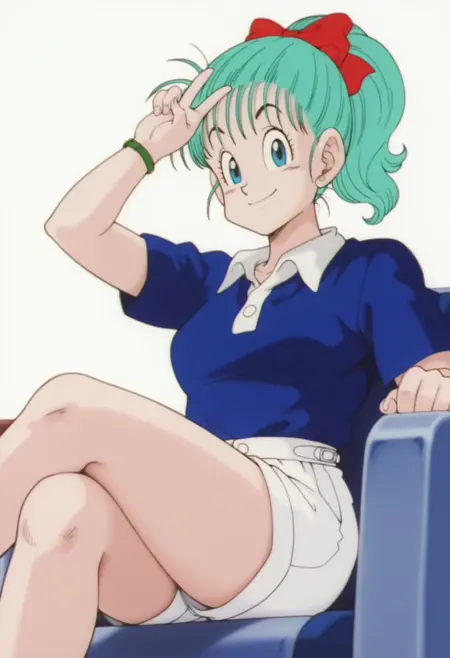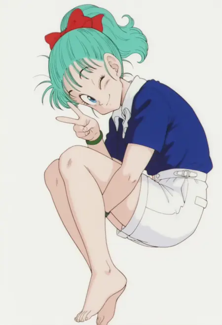 bulma, blue eyes, aqua hair, ponytail, wispy bangs,