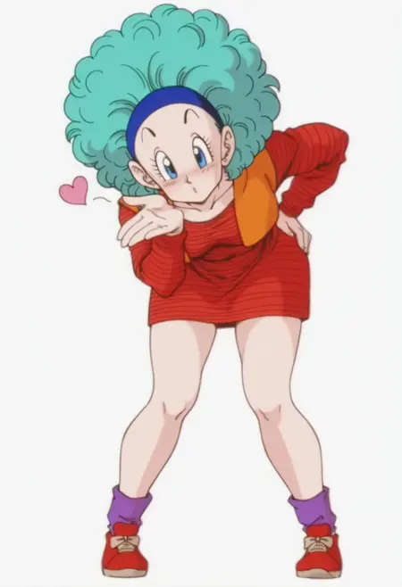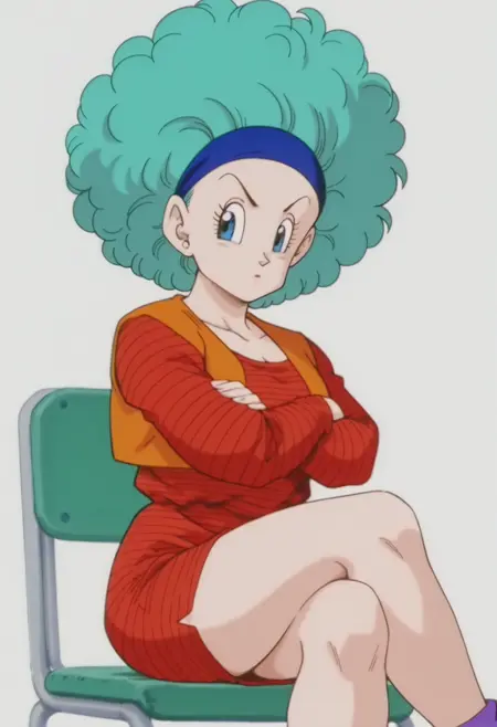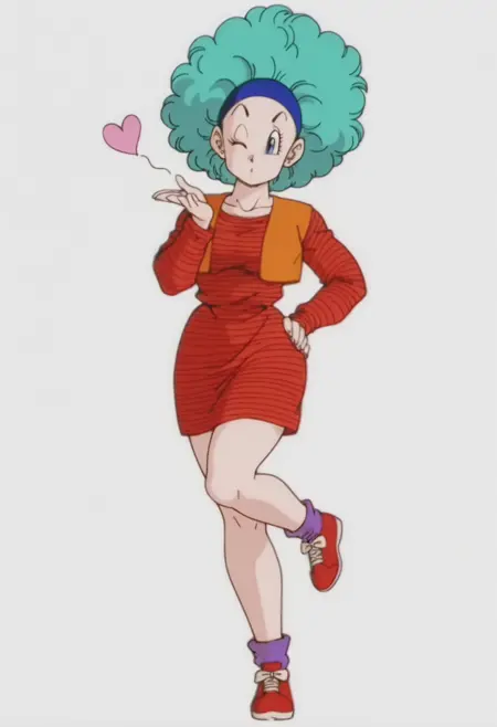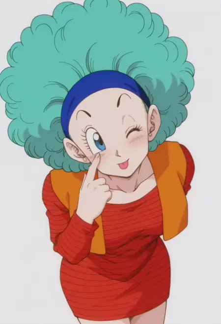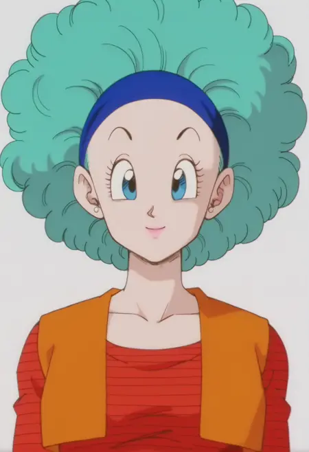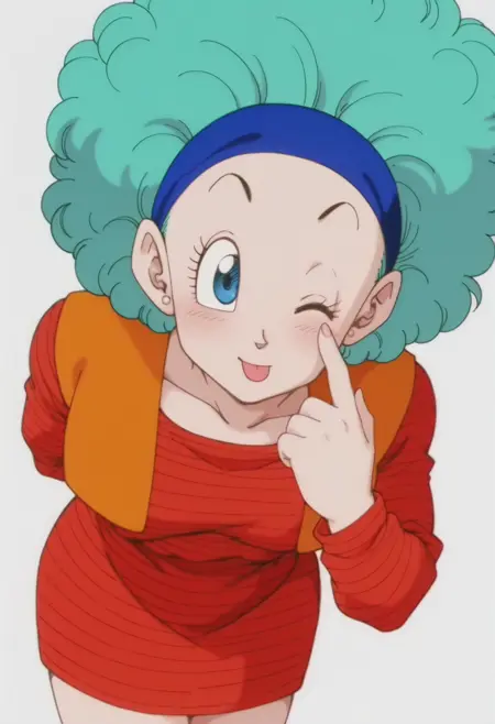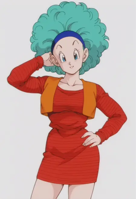 blue hairband, red dress, short dress, long sleeves, striped dress, orange vest,