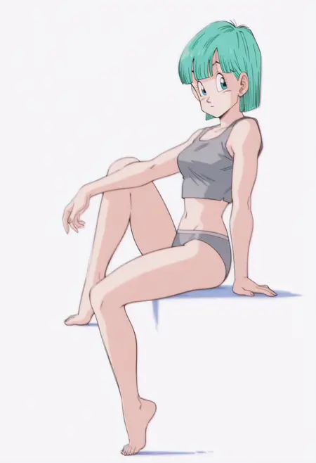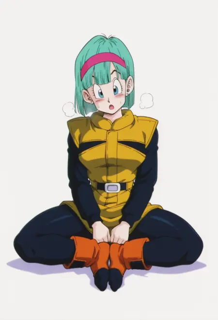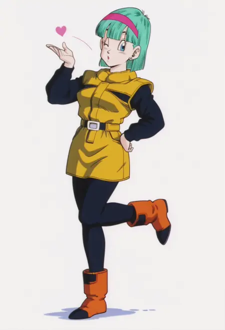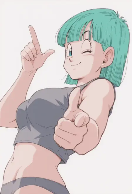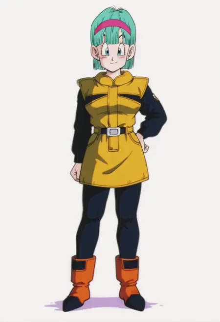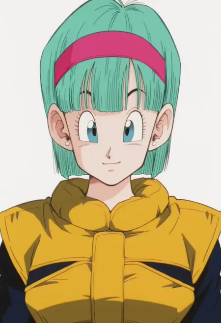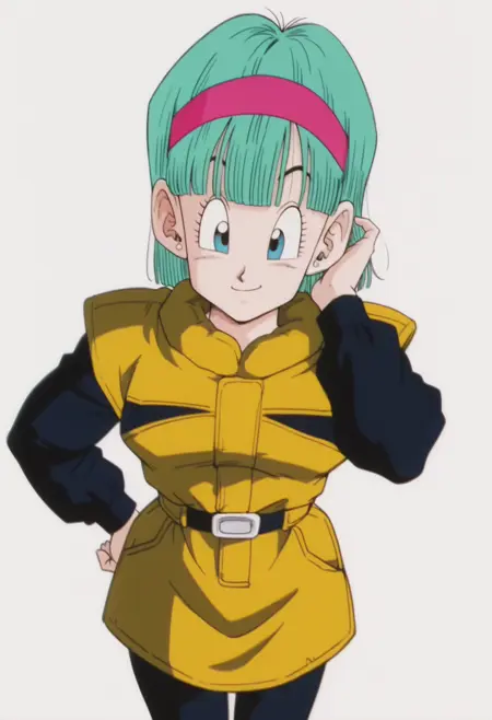 bulma, blue eyes, aqua hair, short hair, blunt bangs,
