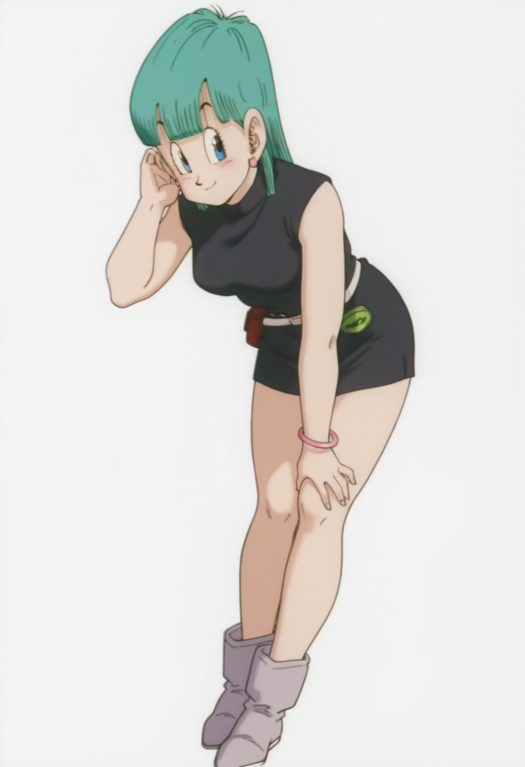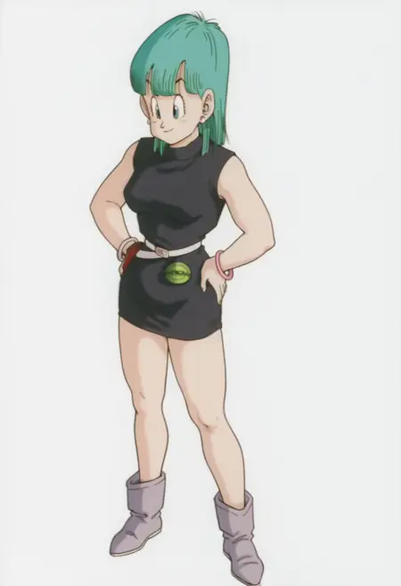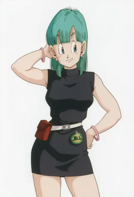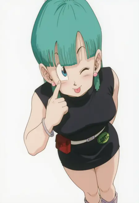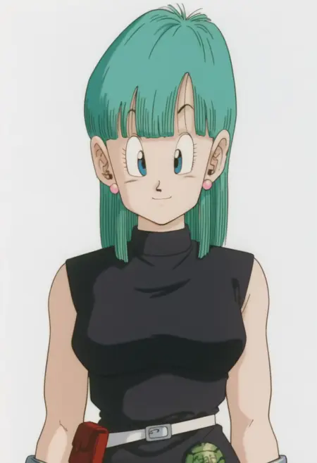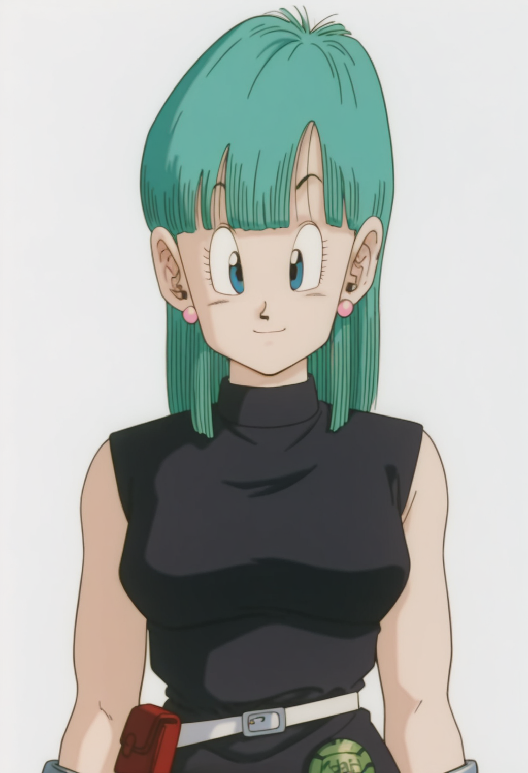 bulma, blue eyes, aqua hair, medium hair, blunt bangs,