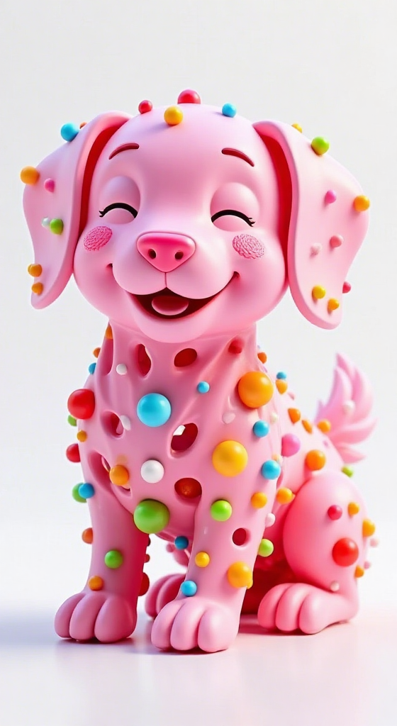 Pink - themed with colorful, fluid - like decorations, zodiac dog, pastel - colored drips, round dots, friendly pose.