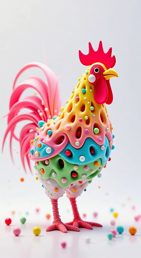 Pink - themed with colorful, fluid - like decorations, zodiac rooster, multicolored bubbles, flowing patterns, bright and lively.