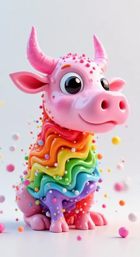 Pink - themed with colorful, fluid - like decorations, zodiac ox, colorful fluid layers, bubble accents, strong form.