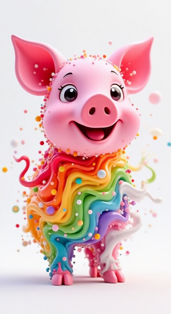 Pink - themed with colorful, fluid - like decorations, zodiac pig, rainbow - hued swirls, candy - like spheres, joyful stance.