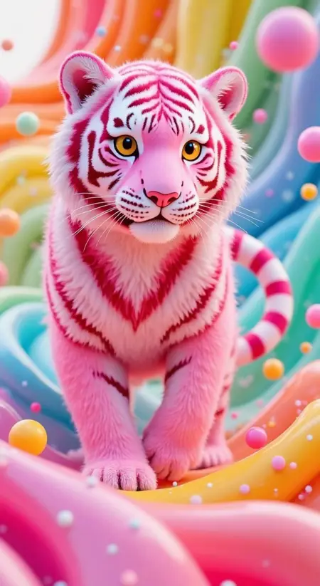 Pink - themed with colorful, fluid - like decorations, zodiac tiger, vibrant fluid waves, dot details, fierce yet cute.