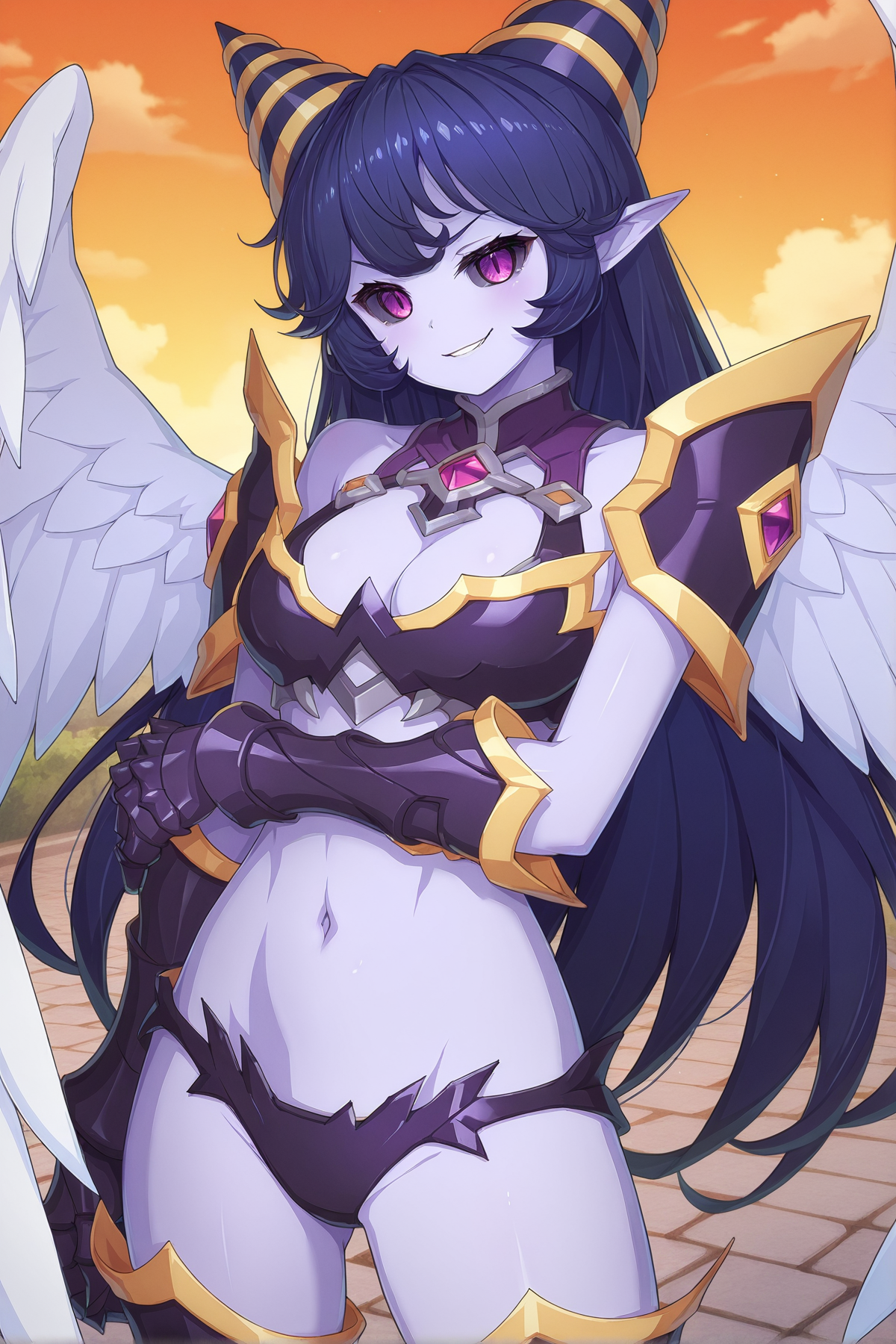 | トレーニングワード | colored skin, light purple skin, purple eyes, slit pupils, black sclera, dark blue hair, long hair, double cone headwear, pointy ears, shoulder guard, cleavage, armored bra, bracer, armored gloves, navel, armored panties, armored thighhighコピーしました! quad feathered wingsコピーしました! |