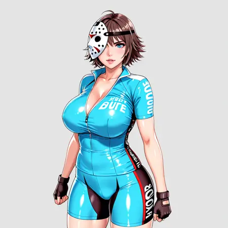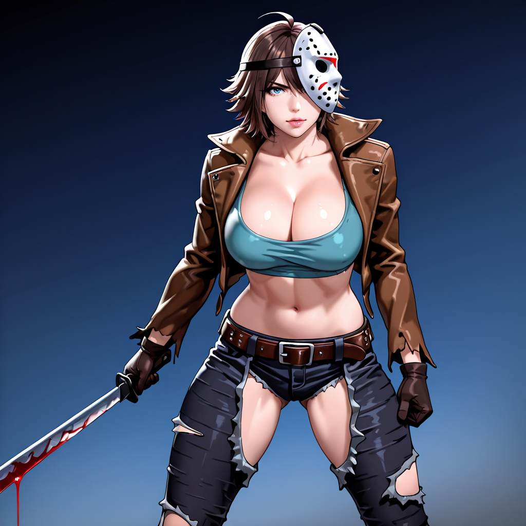 触发词:BishoujoJason, 1girl, 大胸, 面具, 手套, 腰带, 棕发, 夹克, 露腹, 血迹, 乳沟, 短发, 皮裤, 蓝眼, 肚脐, 破洞裤子, 嘴唇, 牛仔布, 露脐上衣