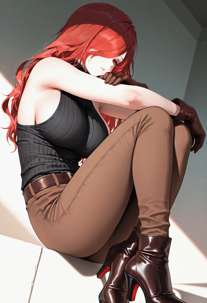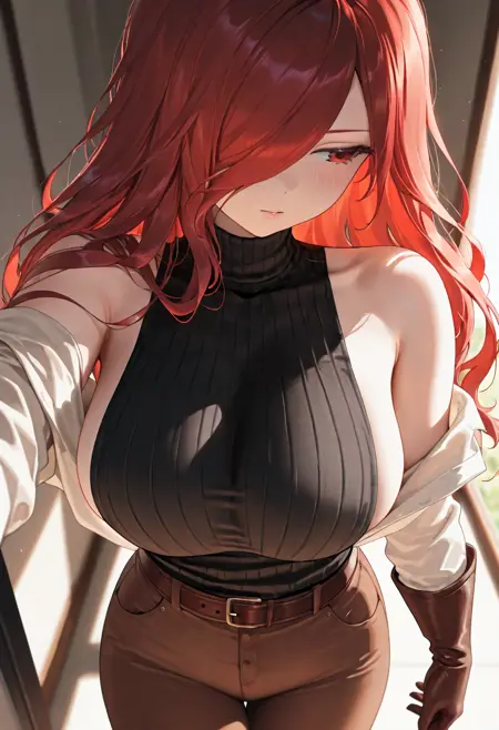 | 학습된 단어 | leini, 1girl, red hair, solo, hair over one eye, red eyes, large breasts, long hair, brown pants, brown gloves, bare shoulders, belt, , turtleneck, sleeveless sweater, black footware,high heels, ribbed sweater, black sweater, sideboob,white shirt복사됨! |