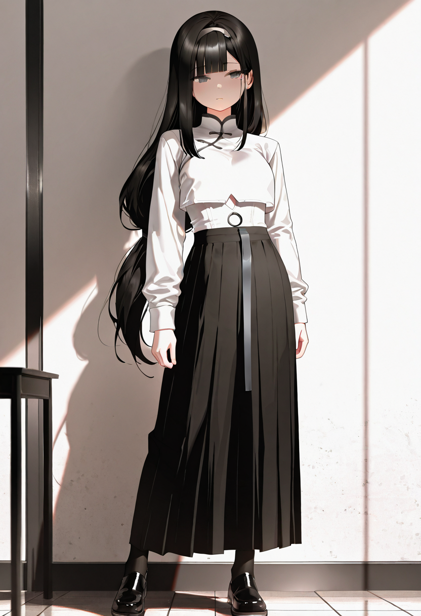 luqi, 1girl,grey eyes, black hair, low-tied long hair, solo, black skirt, black footwear, white shirt,long sleeves, pleated skirt, long skirt,hairband, blunt bangs, mole under eye,breast curtain