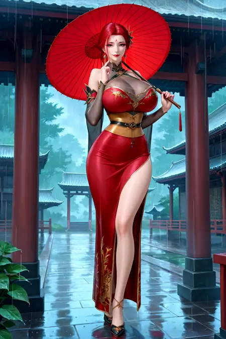 yafei, red hair, forehead mark, hair ornament, red lips, red eyeshadow, jewelry, earrings