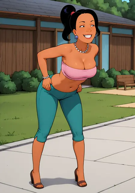 黑发、肚脐、胸部显露、马尾辫、耳环、露脐、裤子、珍珠项链、手镯、吊带背心