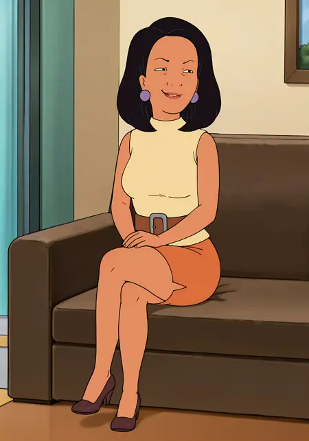 black hair, purple earrings, orange skirt, sleeveless, yellow blouse, belt