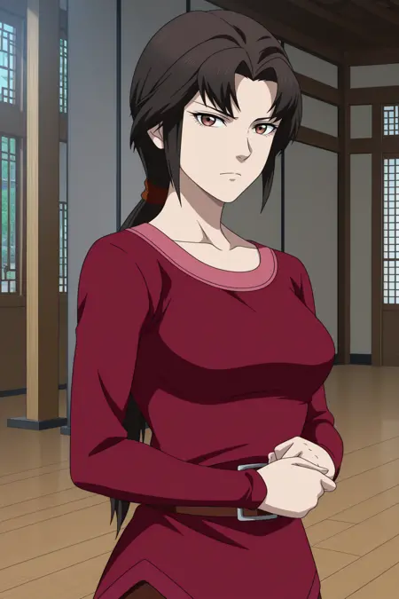 hong xiuying, 긴 머리, 검은 머리, 피그테일, 머리끈, 커튼 머리, 옆머리, 갈색 눈, 긴 소매, 빨간 셔츠, 벨트, 갈색 치마, 긴 치마, 연필 치마, 갈색 신발, 평발 신발