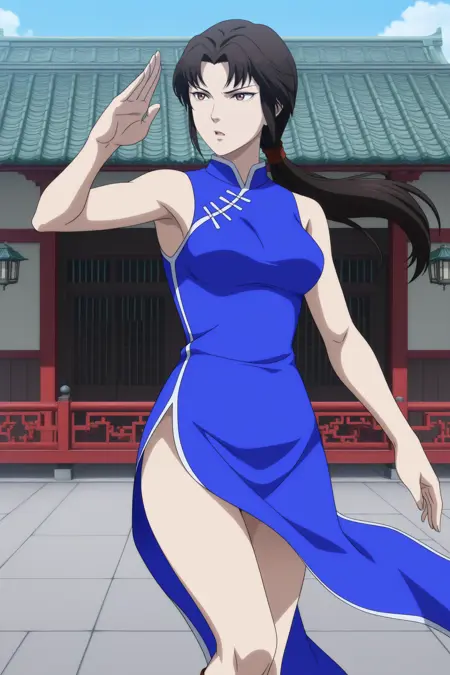 hong xiuying, 긴 머리, 검은 머리, 피그테일, 머리끈, 갈색 눈, 팔이 없는, 차이나 드레스, 파란 드레스, 만다린 칼라, 골반 커튼, 갈색 신발, 평발 신발