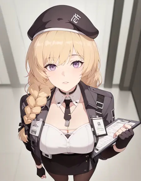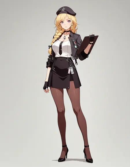 maipgrsailika,1girl,mature female,(aged_up:1.5),solo,long_hair,blonde_hair,twin_braids,hair_ribbon,purple_eyes,beret,black_headwear,choker,detached_collar,dog_tags,white_shirt,open_jacket,black_jacket,long_sleeves,black_necktie,fingerless_gloves,black_gloves,black_skirt,brown_pantyhose,high_heels,black_footwear,holding_clipboard