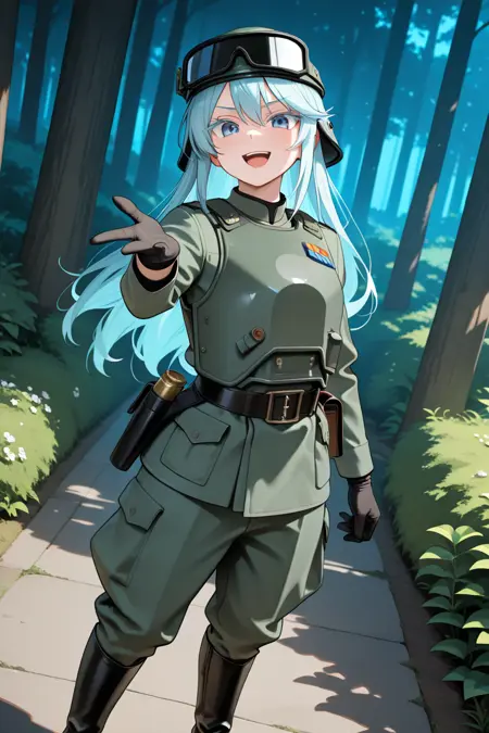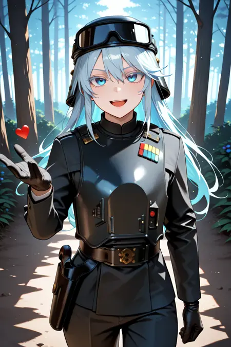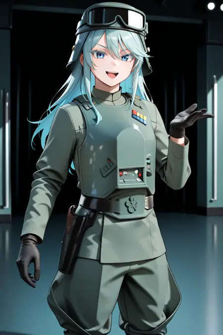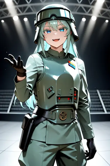 1. <身着灰色盔甲的帝国军官>,灰色胸甲,带面罩头盔,骑马靴,黑色皮腰带,军衔标志,灰色制服,带编码的圆柱形口袋,灰色长裤,黑色手套。
