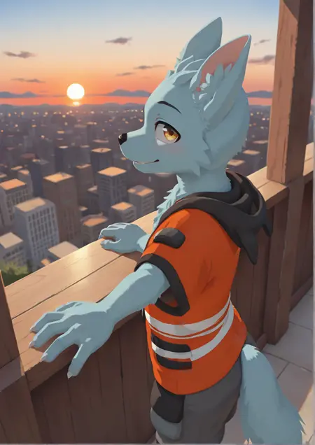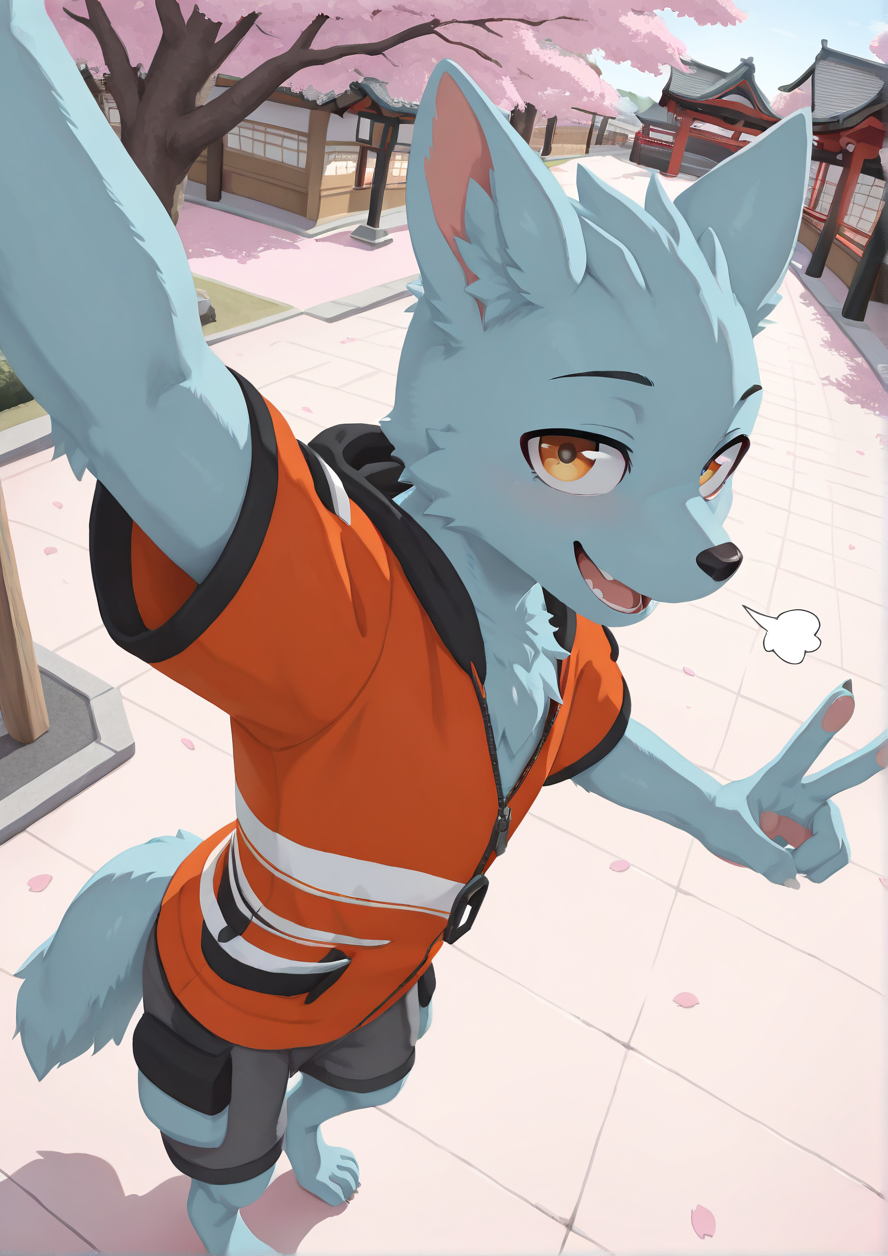 suguru, furry, furry male, light blue fur, orange hoodie, gold eyes,