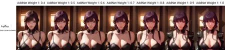 推薦比重:0.5-0.7 で他のLoRAと組み合わせ、0.8-1 でキャラクターを表現、0.2-0.4 で少しカフカらしい雰囲気を出せます