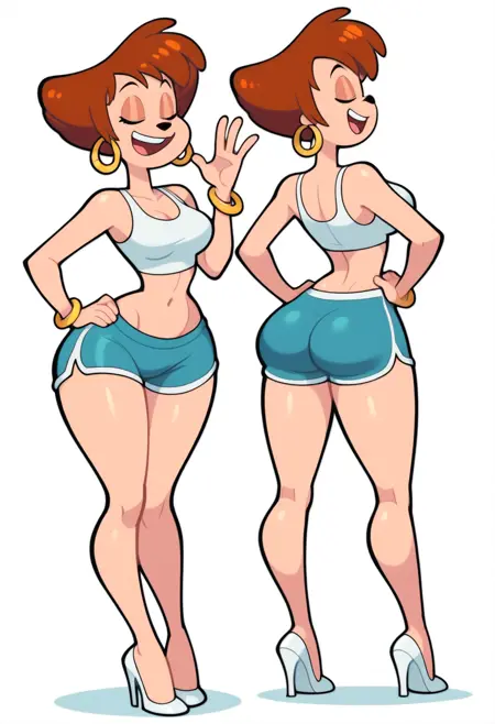 - ハイヒール, 広い hips, 茶髪, 睫毛, 短髪, イヤリング,
