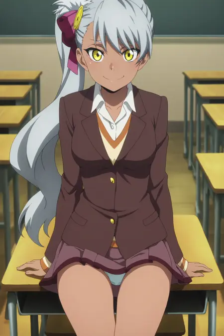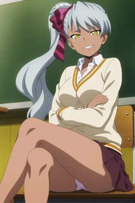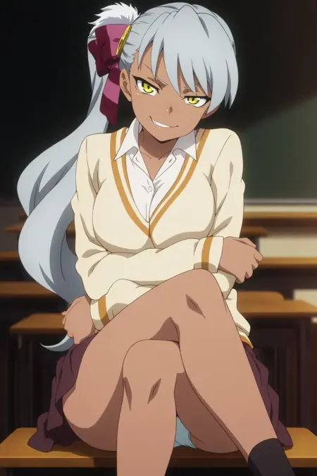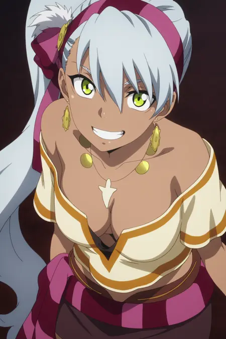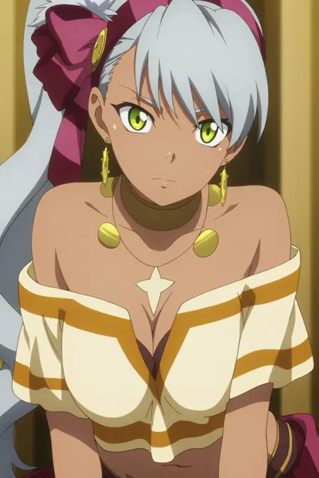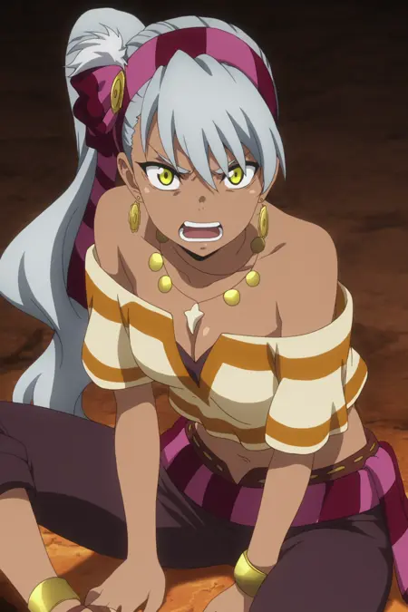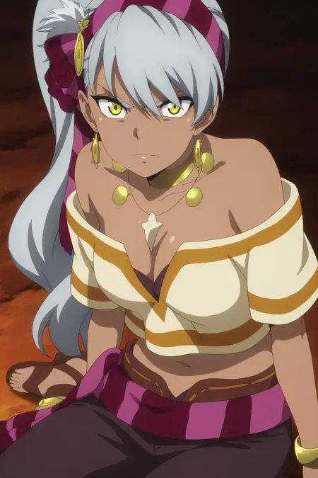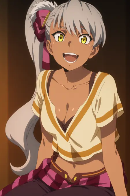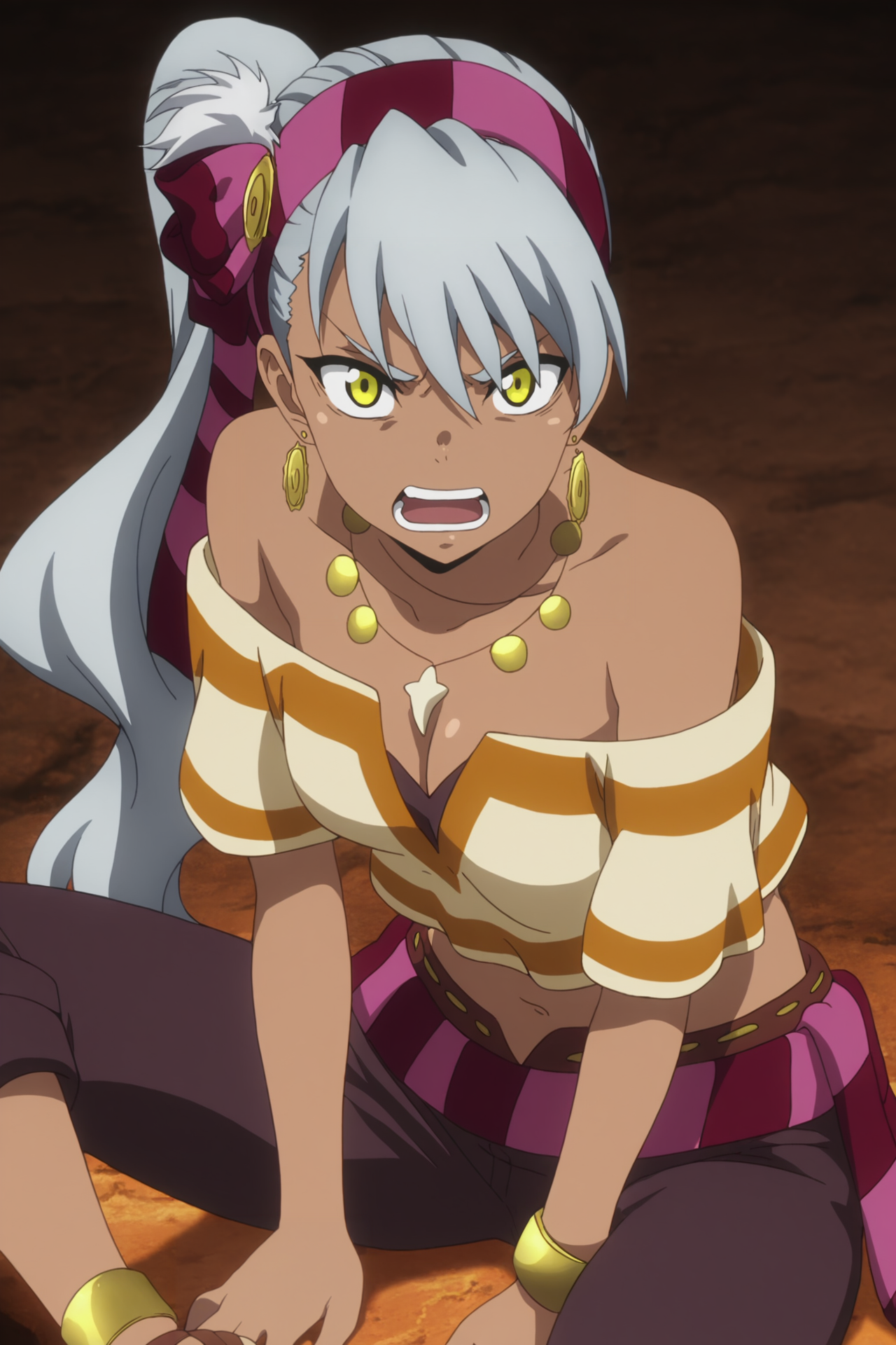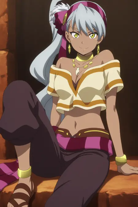| トレーニングワード | Emma, 1girl, solo, long hair, medium breasts, dark skin, dark-skinned female, side ponytail, yellow eyes, grey hair, navel, cleavage,コピーしました! bare shoulders, jewelry, necklace, earrings, bracelet, anklet, hairband, headband, striped clothes, crop top, shirt, midriff, pants, sandals,コピーしました! |