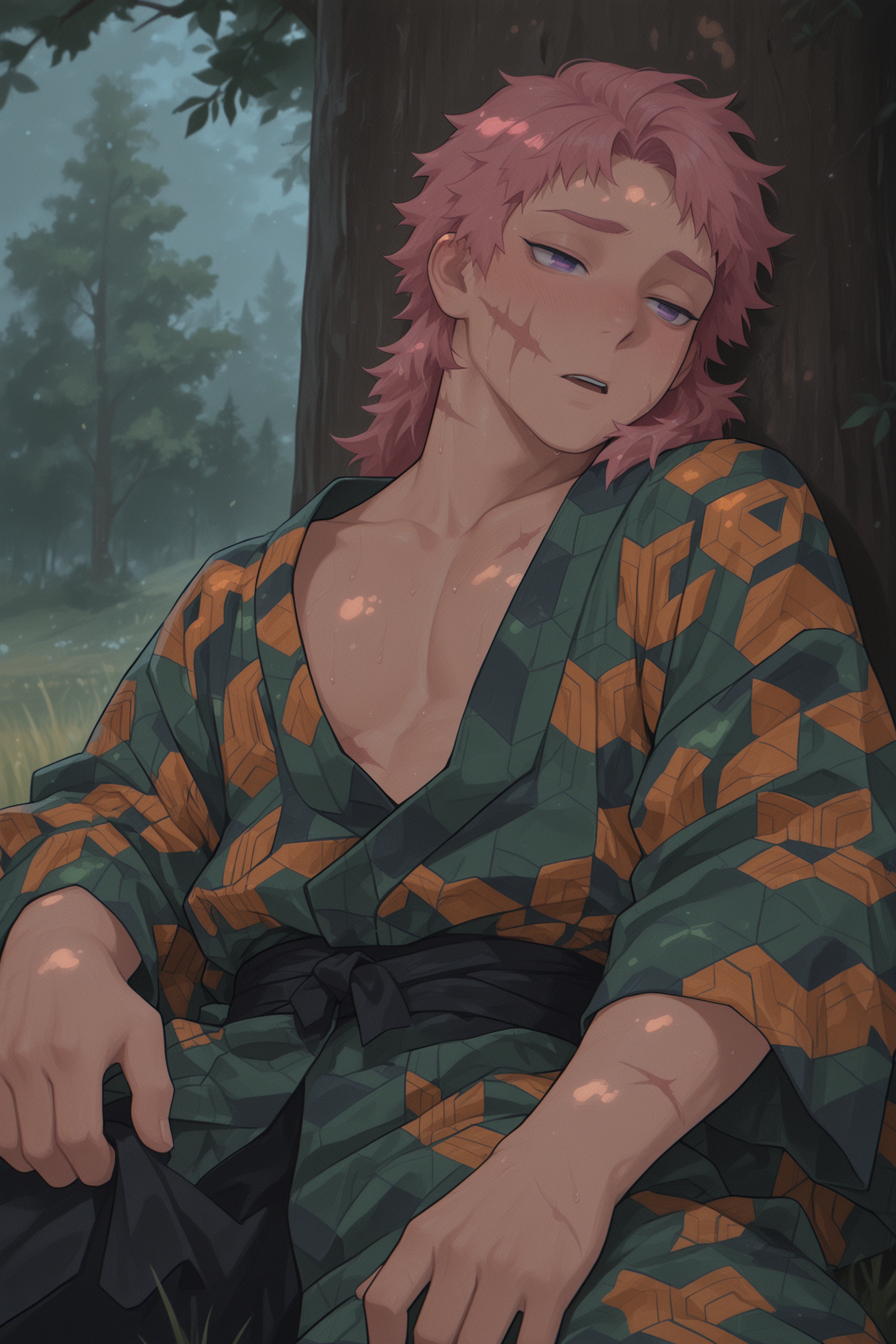 - 1boy, solo, male focus, 粉色头发, 疤痕, 白色外衣, 和服, 日本服饰