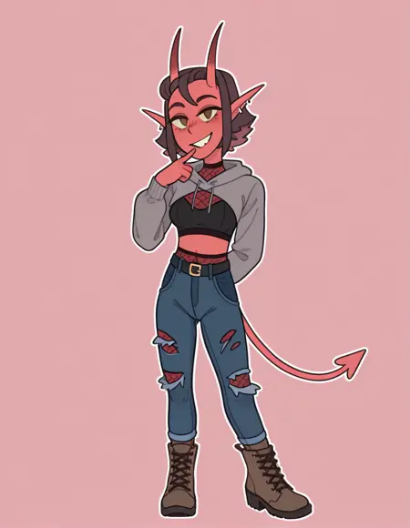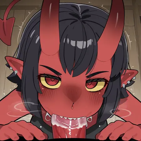 demonsal, 1girl, 단발, 검은 머리, 빨간 눈, 꼬리, 귀걸이, 뿔, 이빨, 뾰족한 귀, 색상이 있는 피부, 피어싱, 악마 소녀, 악마 뿔, 날카로운 이빨, 귀 피어싱, 악마 꼬리, 색상이 있는 공막, 붉은 피부, 노란 공막, 빨간 꼬리, 검은 머리