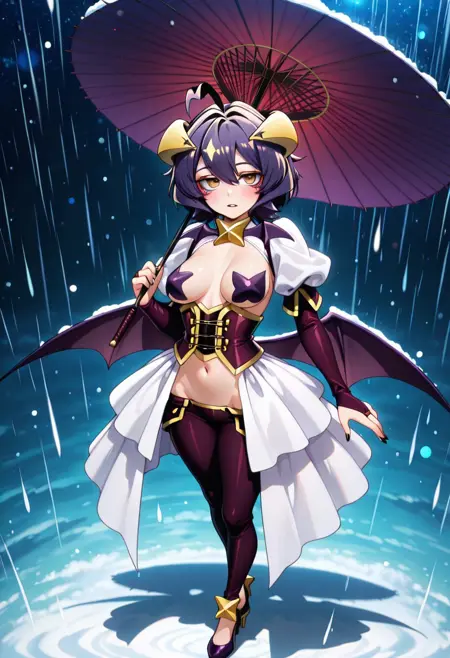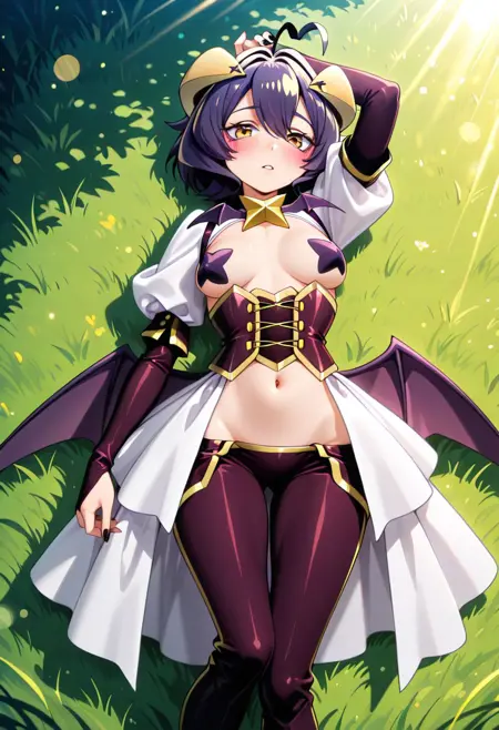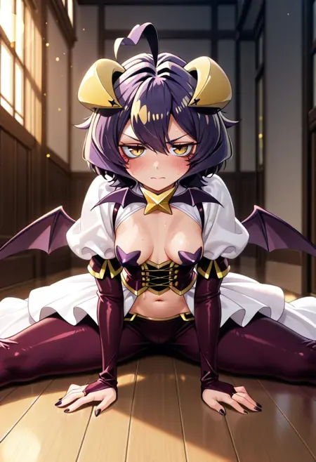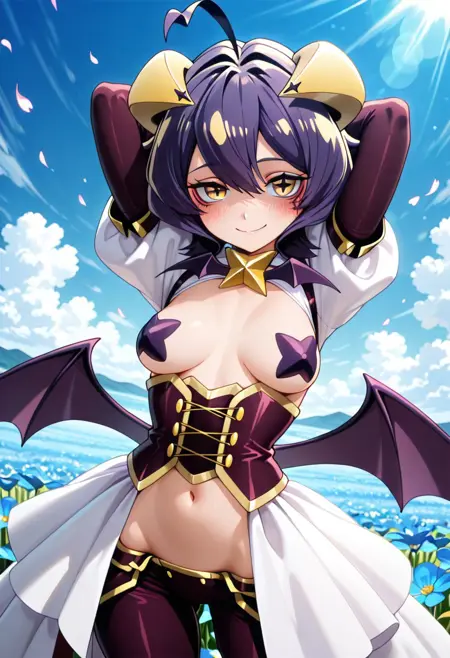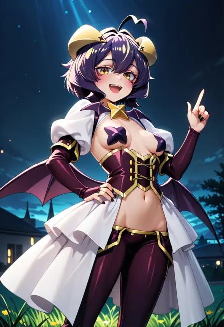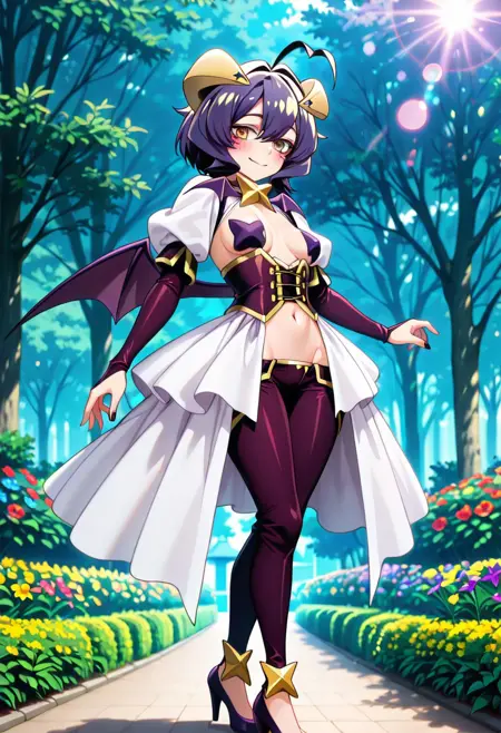 캐릭터의 주요 복장: 코르셋, 별 모양의 페이스티, 분리된 가슴, 긴 소매, 풍성한 소매, 신부 장갑, 낮은 다리 바지, 보라색 바지, 보라색 하이힐, 악마의 뿔, 악마의 날개, 배꼽, 허리, 흰색 쇼걸 스커트,