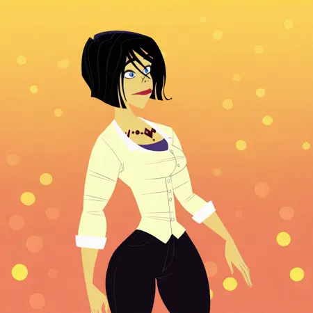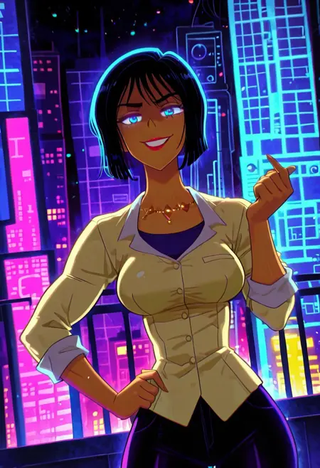 ParkerKovakPP, 1girl, solo, 黒髪, 短髪, 前髪,ボブカット, 青い目, 鼻, 赤いリップ, ネックレス, ベージュのジャケット, 青いシャツ, 大きな胸, 厚い太もも, 黒いズボン, ボタン, 撥ね上げた袖, 白いカラー,