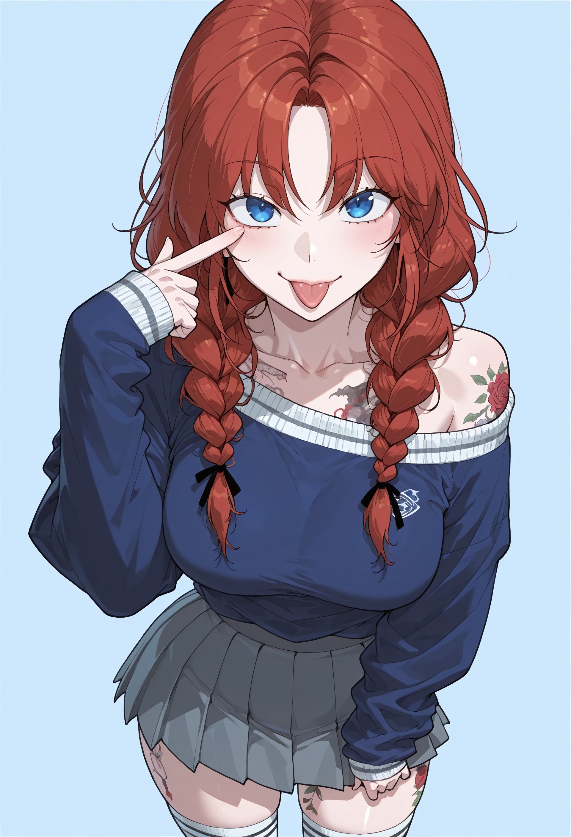 1girl, solo, 빨간 머리, 더블 브레이드, 브레이드, 앞머리, 갈라진 앞머리, 파란 눈, 입술, 콧대, 중간 크기 가슴, 문신, 전신 문신