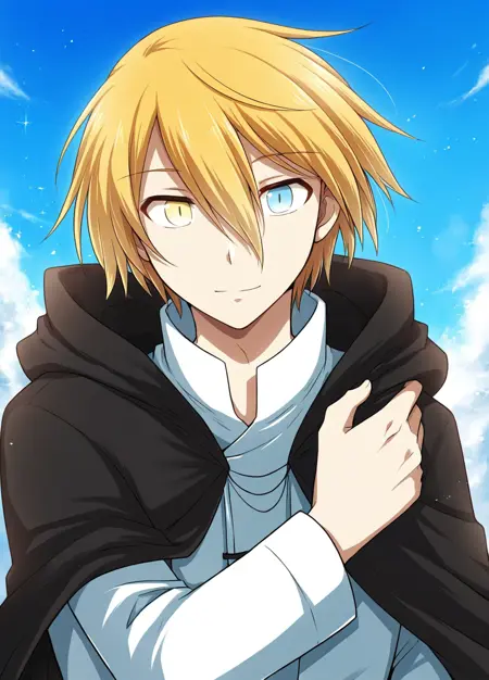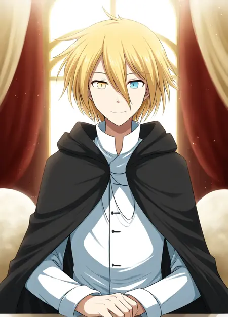 作成タグ:左目青色、右目黄色、虹彩異色症、人間、ミディアムヘア、黄色の髪色、黒いマント、白いローブ