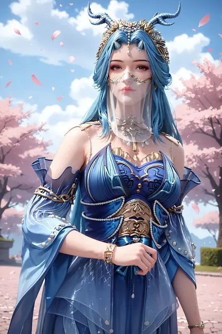 girl, veil, solo, jewelry, dress, blue dress, mouth veil, bracelet, horns, blue hair, breasts, long hair, hair ornament, bare shoulders, detached sleeves