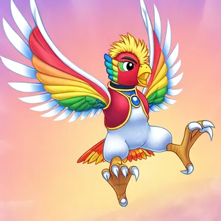 bird, phoenix, red and white body, black eyes, rainbow wings, blonde hair, mohawk, yellow beak, talons, chest jewel, bird tail, tail feathers,