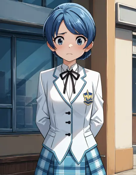 유니폼: pmmmmelissa, mlspbc, 흰 셔츠, 검은 넥 리본, 흰 블레이저, 연한 파란 체크 스커트