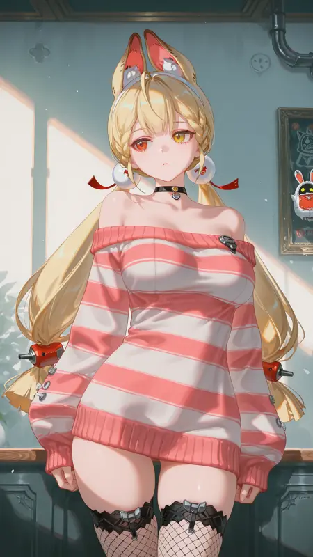 頭:Alice: Celestian Etiquette \(Zenless Zone Zero\), 1girl, solo, blonde hair, long hair, twintails, low twintails, braid, animal ears, white hair accessory, heterochromia, red eyes, yellow eyes, orange eyes,