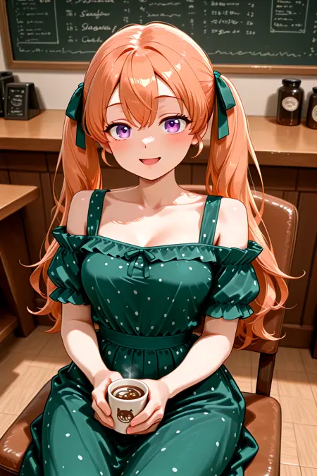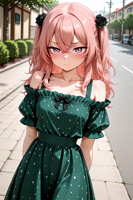Emerald_Ruffle_OffShoulder_Polka_Maxi_Dress, green dress, off-shoulder dress, long dress, bare shoulders, puffy short sleeves, polka dot, collarbone, frills
