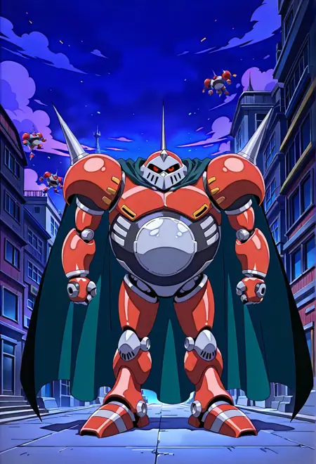 BlackEggmanOVA, mecha, large, menacing robot, red and black armor, dark green cape, red eyes, black sclera, red-silver metallic body, chubby