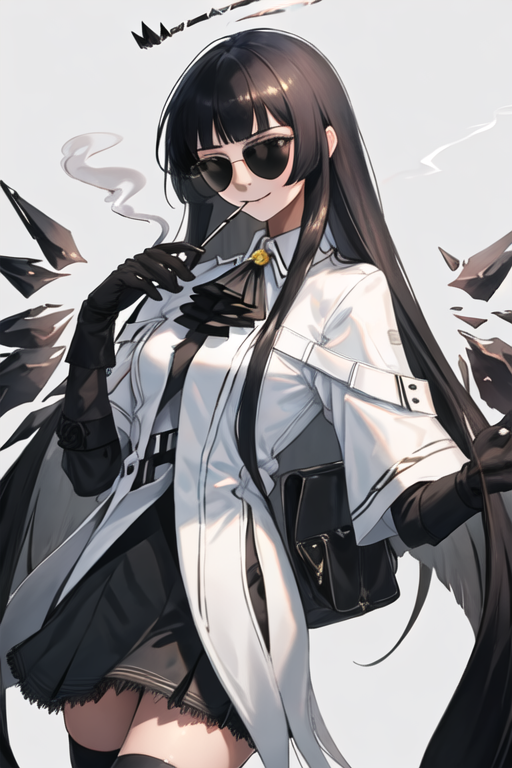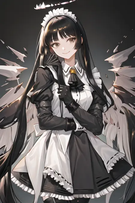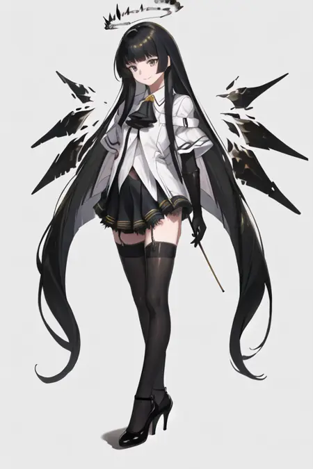 The trigger word is virtuosa_arknights, and the pruned tags are black_hair, long_hair, blunt_bangs, mole, mole_under_eye, straight_hair, halo, sidelocks, black_halo, dark_halo, broken_halo, hime_cut, very_long_hair, black_wings, wings, energy_wings, detached_wings, pale_skin, black_eyes, breasts, colored_inner_hair, two-tone_hair, multicolored_hair, eyelashes, white_pupils, bright_pupils, grey_hair, medium_breasts, floating_hair, ahoge. When some features (e.g. hair color) are not so stable at some times, you can add these them into your prompt.