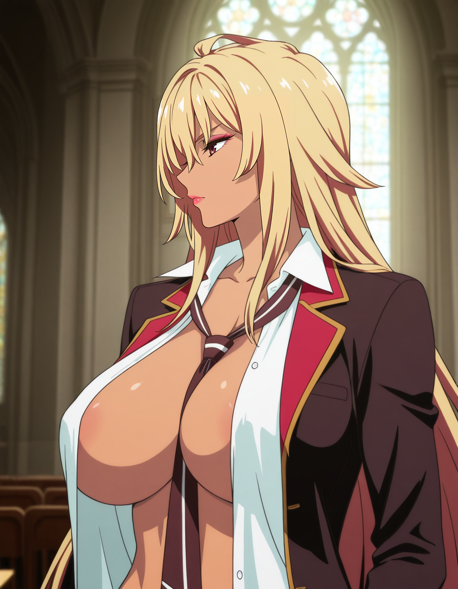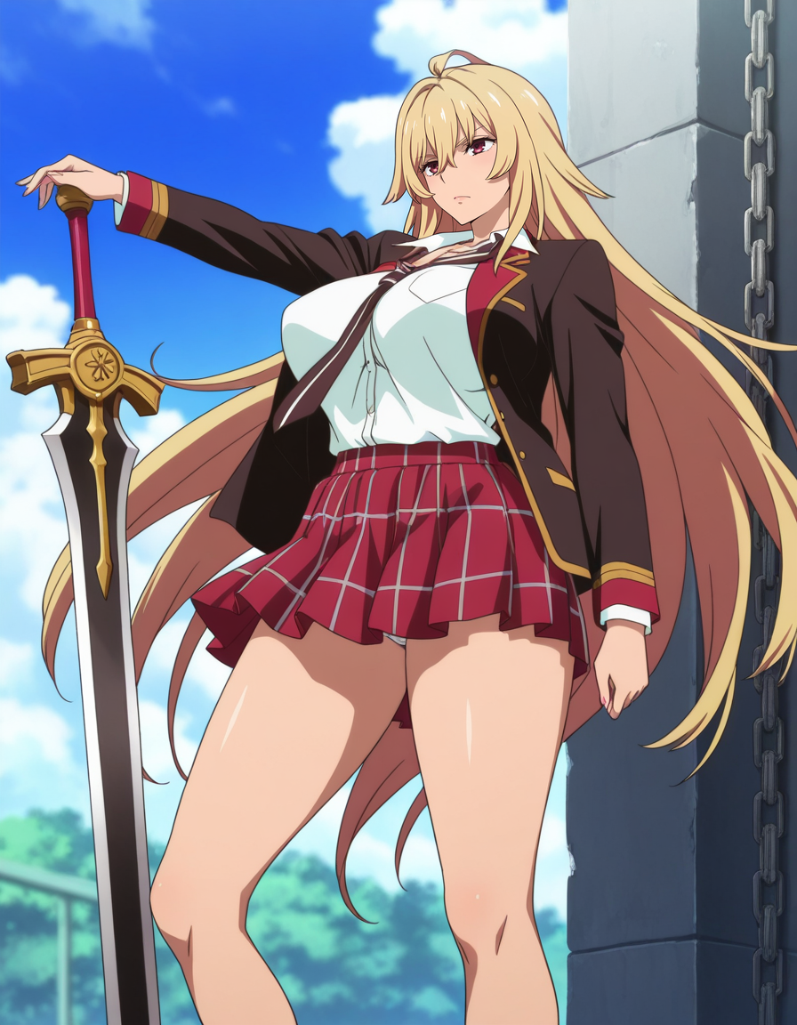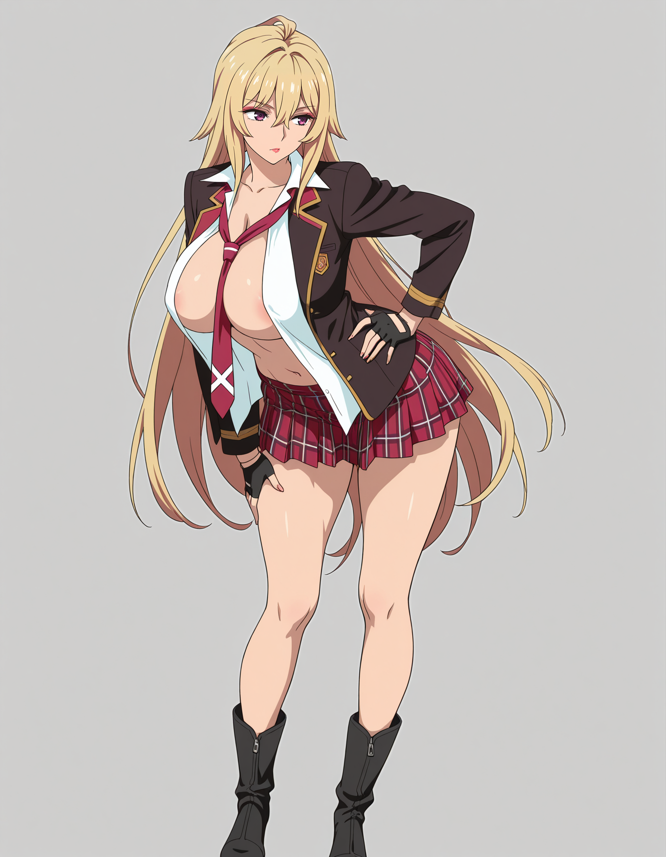 very_long_hair,blonde_hair,red_lips,school_uniform,jacket,loose_necktie,plaid_skirt,red_skirt,pleated_skirt,purple_eyes,fingerless_gloves,black_gloves,large_breasts,black_boots,cleavage,navel,anime_coloring