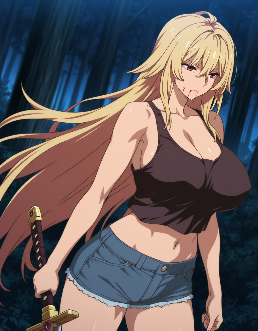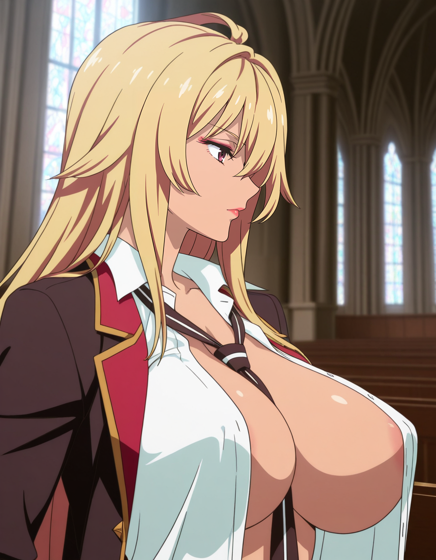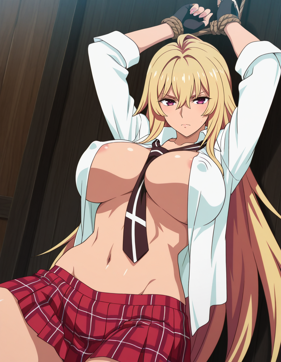 very_long_hair,blonde_hair,red_lips,school_uniform,jacket,loose_necktie,plaid_skirt,red_skirt,pleated_skirt,purple_eyes,fingerless_gloves,black_gloves,large_breasts,black_boots,cleavage,navel,anime_coloring