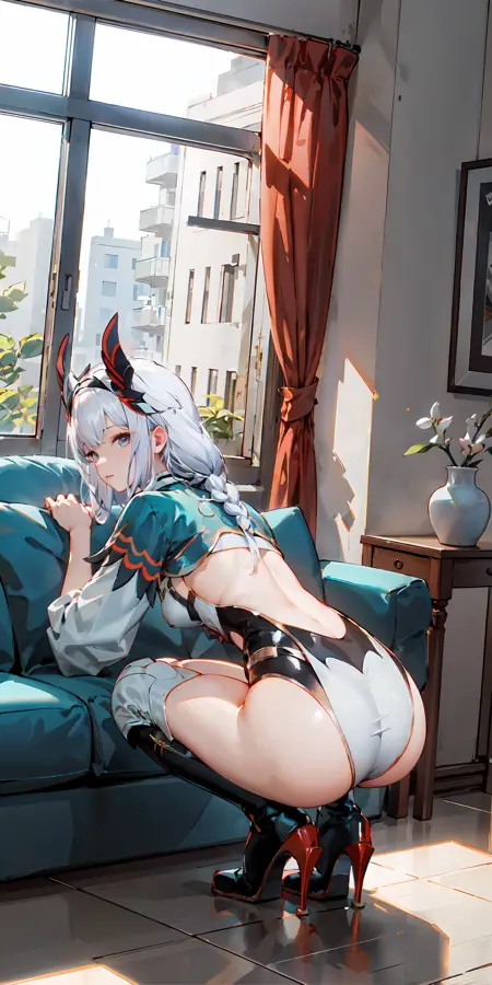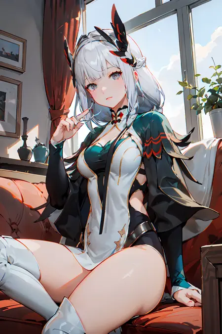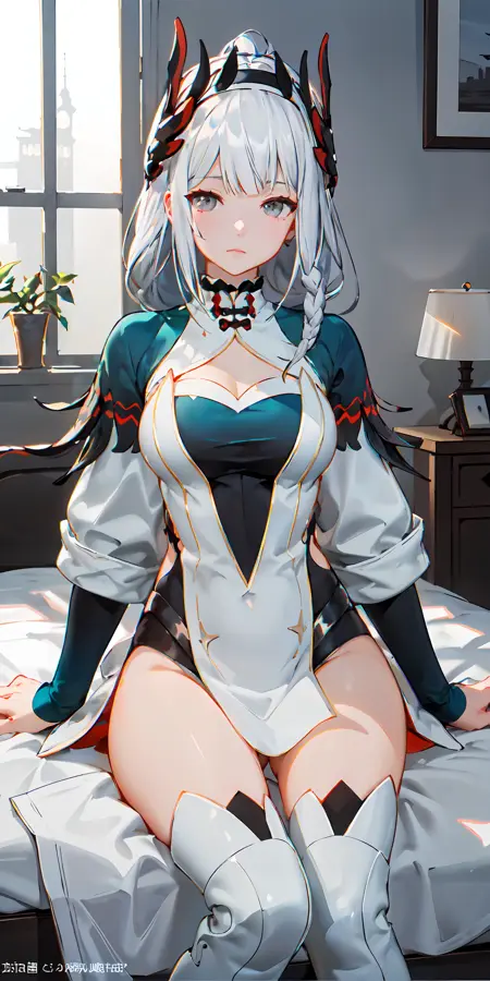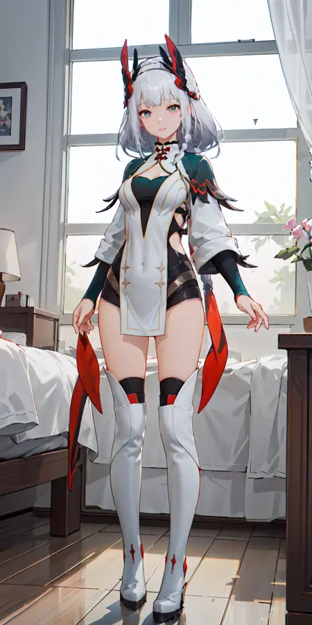 【ポジティブプロンプト】:chenxingS,レオタード, 太ももブーツ, ペリビカルカーテン, 頭部装具, 赤いストラップ, 白髪, 灰色の目, 編み髪, 1girl, 立ち姿, いたずらな顔, 全身, 視線を観察者に向けている, 室内, 寝室, 窓, 昼間, 木漏れ日, (masterpiece,best quality,beautiful and aesthetic:1.2), lora:chenxingS-V1B:0.7
