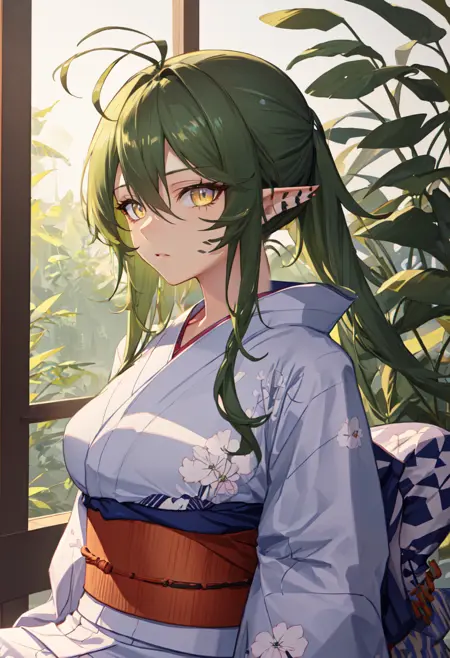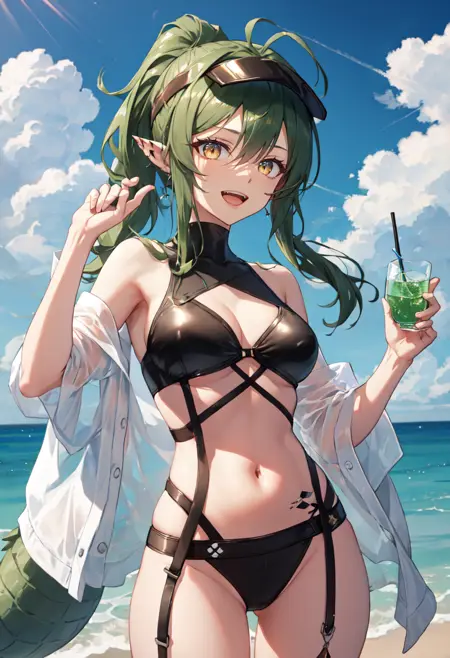 - 已精简的角色标签为:绿发、长发、尖耳、黄眼、胸部、鳄鱼尾、眼间发、尾巴、触须发、马尾、中等胸部。当角色的核心特征(如发色)不够稳定时,您可以在提示词中添加这些标签。