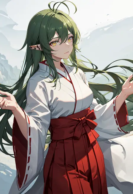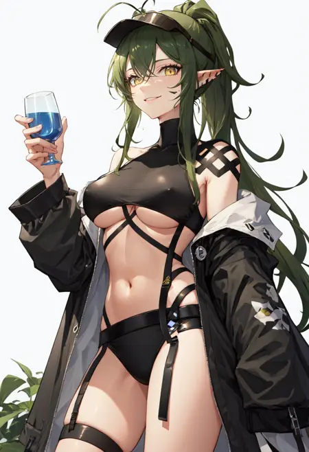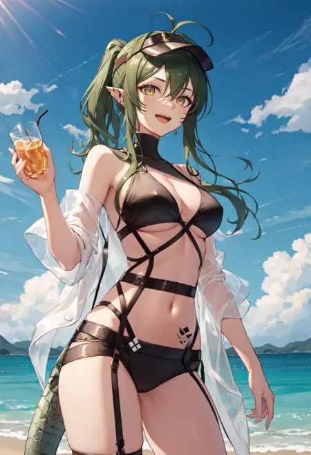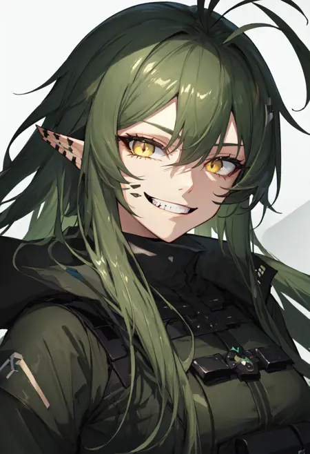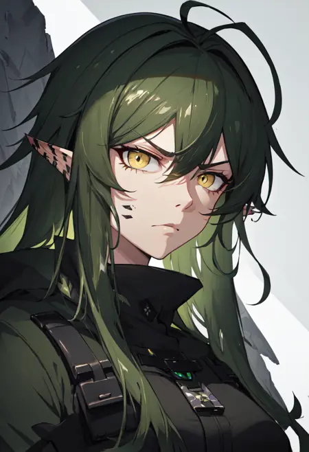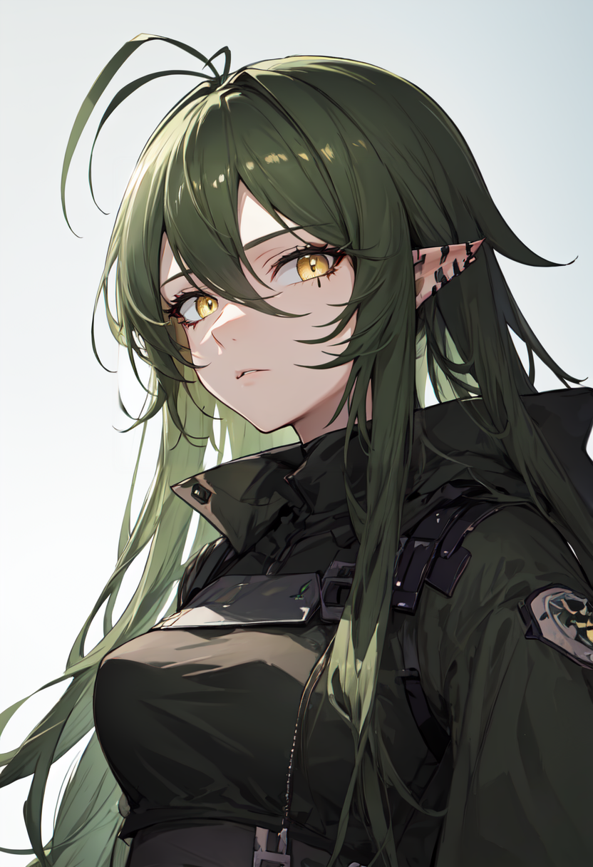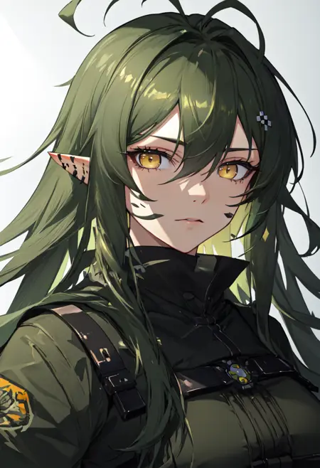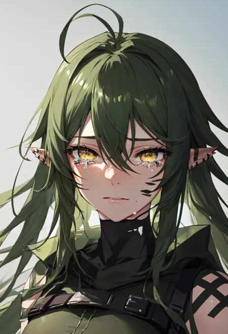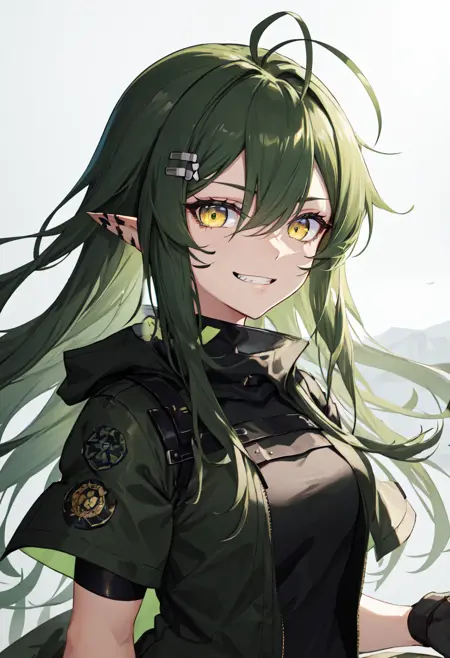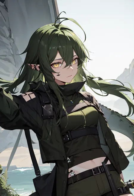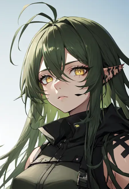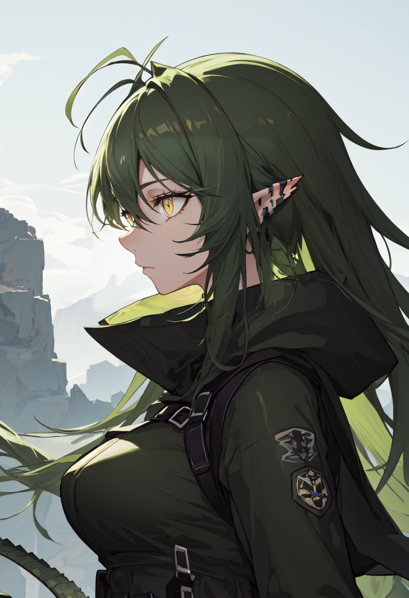 触发词为 gavial_arknights,精简标签为 green_hair, long_hair, pointy_ears, yellow_eyes, breasts, crocodilian_tail, hair_between_eyes, tail, antenna_hair, ponytail, medium_breasts。当某些特征(如发色)偶尔不稳定时,您可将这些标签加入提示词中。
