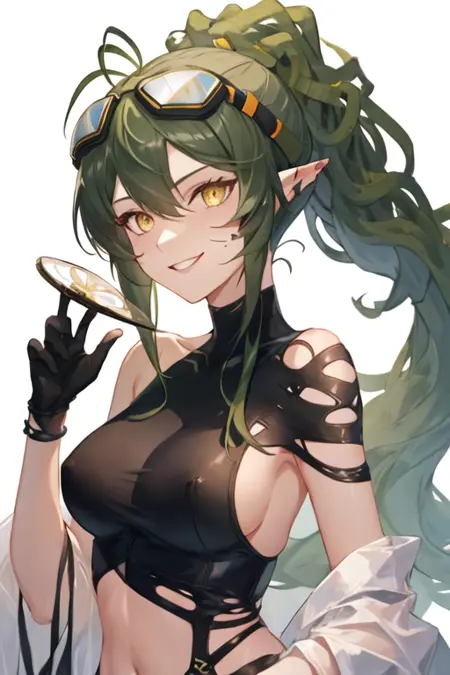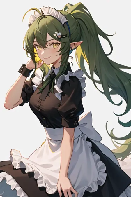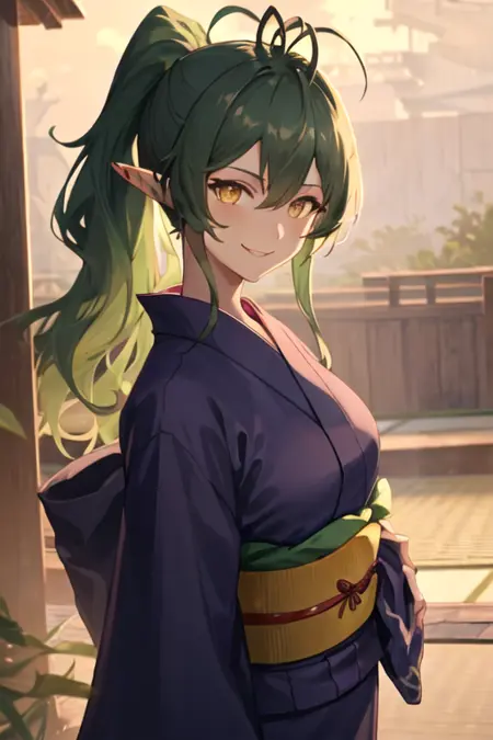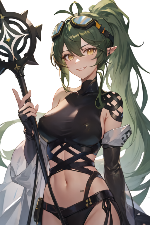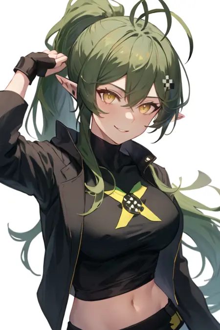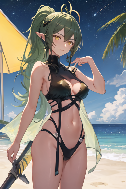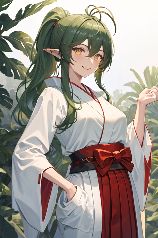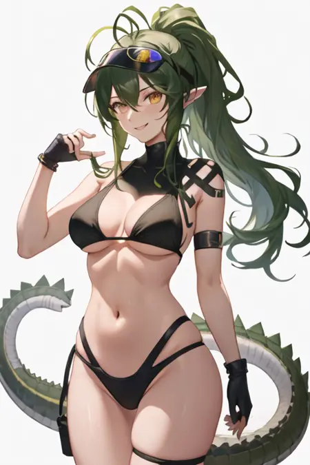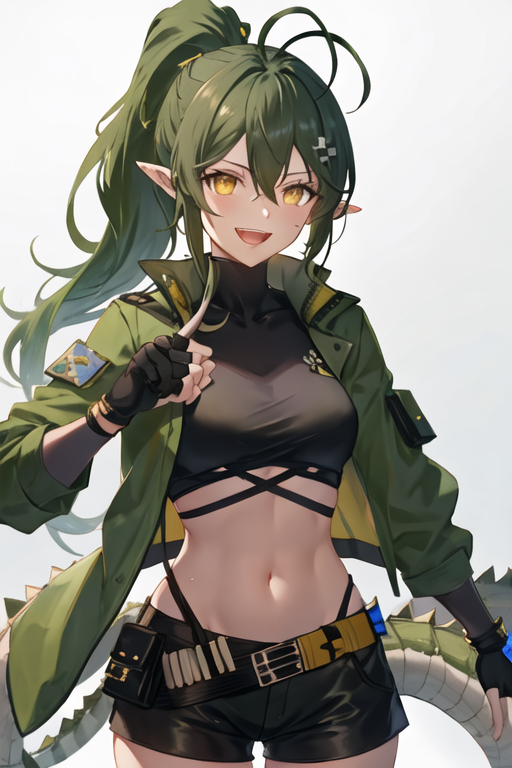 - The pruned character tags are green hair, long hair, pointy ears, yellow eyes, breasts, crocodilian tail, hair between eyes, tail, antenna hair, ponytail, medium breasts. You can add them into prompts when core features (e.g. hair color) of character is not so stable.