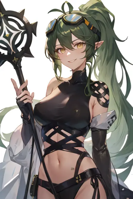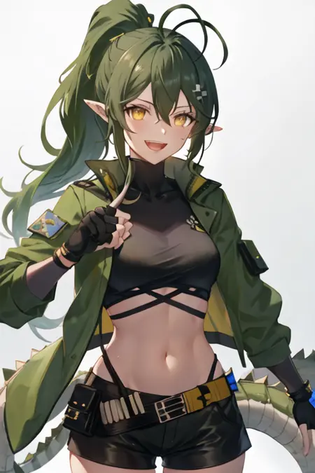 触发词为 gavial_arknights,精简标签为 green_hair, long_hair, pointy_ears, yellow_eyes, breasts, crocodilian_tail, hair_between_eyes, tail, antenna_hair, ponytail, medium_breasts。当某些特征(如发色)偶尔不稳定时,您可将这些标签加入提示词中。