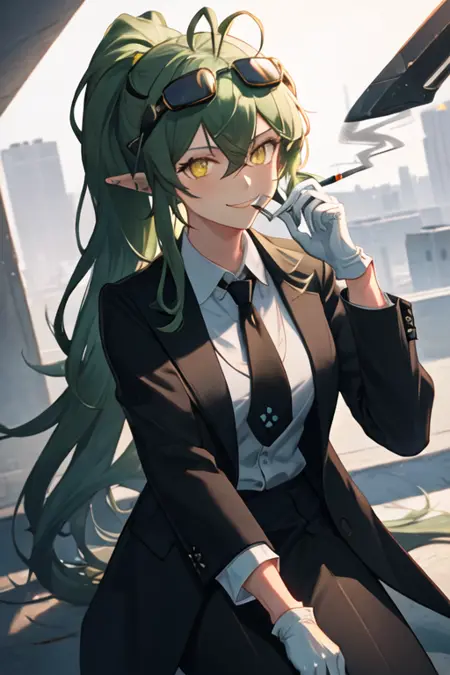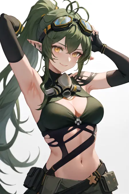 The trigger word is gavial_arknights, and the pruned tags are green_hair, long_hair, pointy_ears, yellow_eyes, breasts, crocodilian_tail, hair_between_eyes, tail, antenna_hair, ponytail, medium_breasts. When some features (e.g. hair color) are not so stable at some times, you can add these them into your prompt.